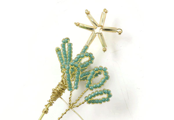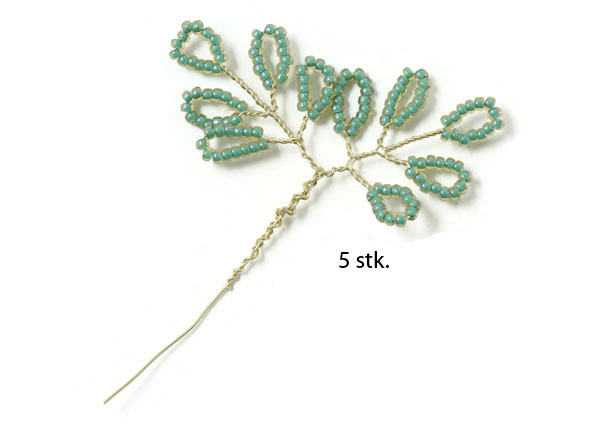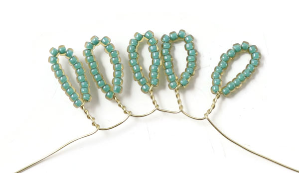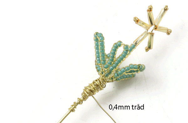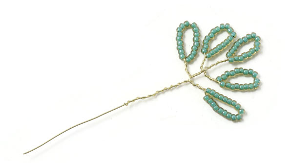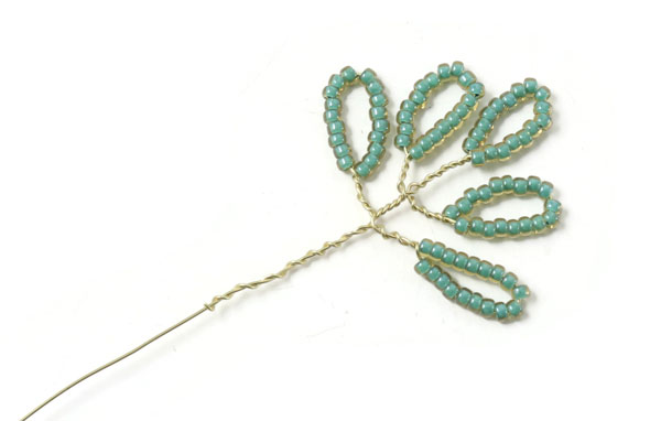 Fädle Perlen auf den Draht, bis du ein 10 cm langes Stück mit Perlen hast ... und mache daraus 5 Blätter.