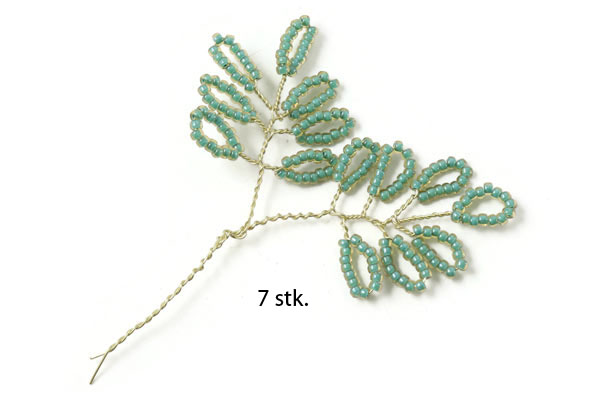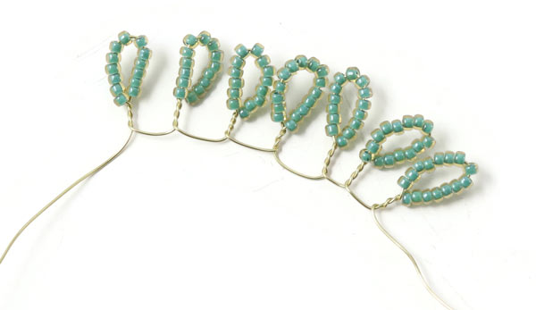 Fädle Perlen auf den Draht, bis du ein 14 cm langes Stück mit Perlen hast ... und mache daraus 7 Blätter.