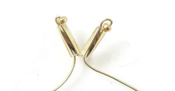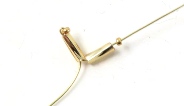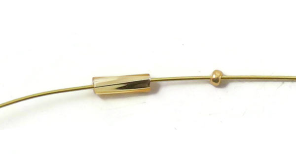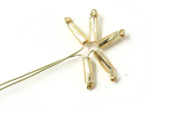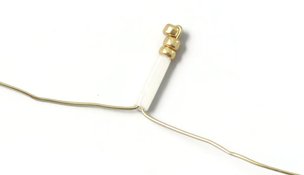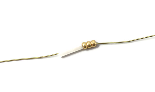 Schneide ein kleines Stück von dem Draht mit 0,3 mm Durchmesser ab. Platzieren eine weiße Rohrperle + 3 Goldperlen mittig auf dem Draht.