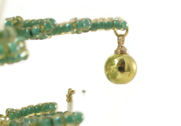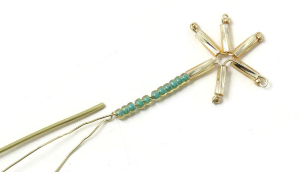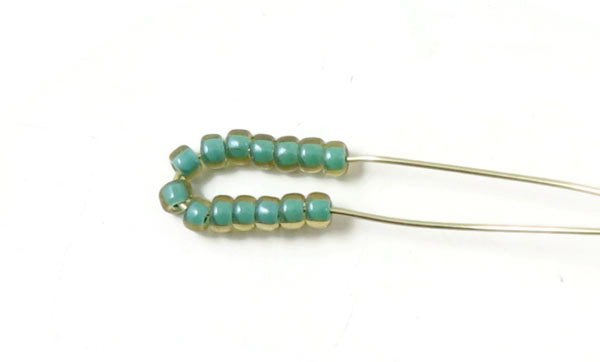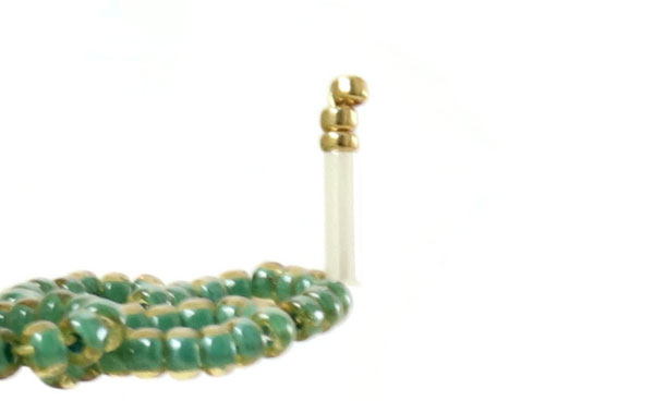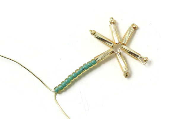 Führe beide Drahtenden durch 1 Rohrperle + 11 grüne Seedbeads.