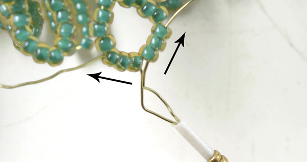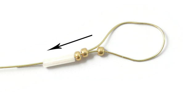 Überspringe die letzte Goldperle ... und ziehe den Draht durch 2 Goldperlen + 1 Rohrperle zurück.