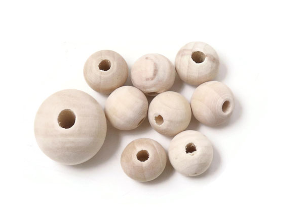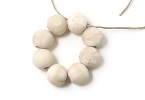 Fädle 8 Holzperlen mit 12 mm Durchmesser auf eine Schnur. Wir haben für unser Beispiel gewachste Baumwollschnur mit 1,2 mm Durchmesser verwendet.
