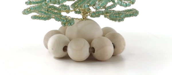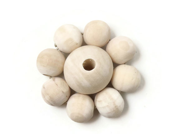 Stelle eine große Holzperle mit dem Loch nach oben in den Ring aus kleineren Holzperlen. Klebe den Ring an der großen Holzperle fest.