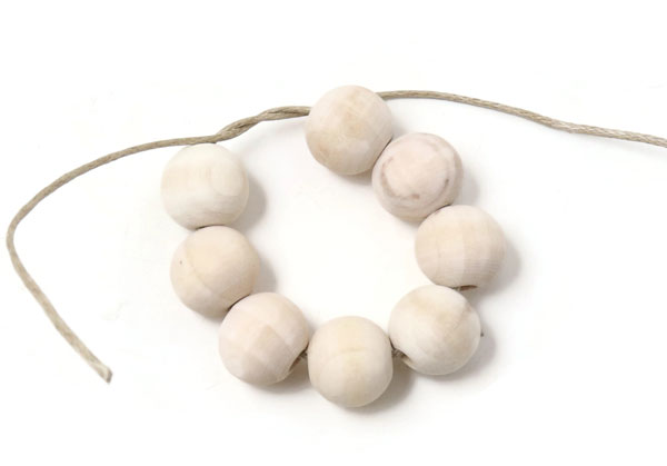 Fädle 8 Holzperlen mit 12 mm Durchmesser auf eine Schnur. Wir haben für unser Beispiel gewachste Baumwollschnur mit 1,2 mm Durchmesser verwendet.